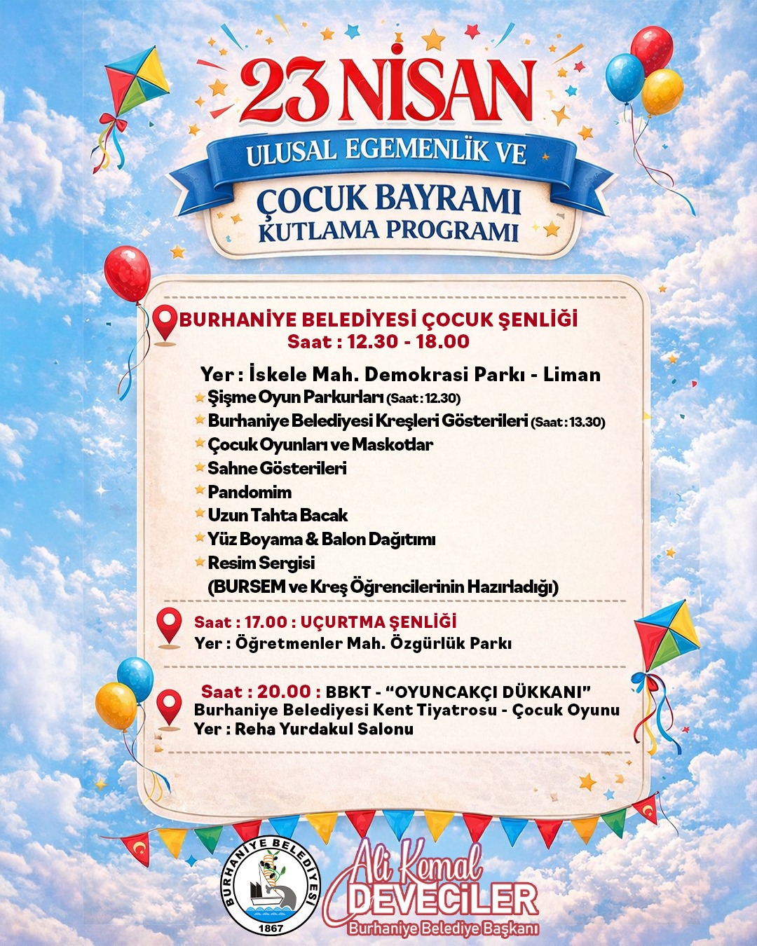 Hemşehrilerini 23 Nisan ruhuna ortak olmaya davet eden Burhaniye Belediye Başkanı Ali Kemal Deveciler, “Kahramanmaraş ve Şanlıurfa’da yaşanan üzücü olaylar hepimizin yüreğinde derin bir iz bırakmıştır. Bu acılar, bizlere bir kez daha Atatürk’ün ışığında, çağdaş, bilinçli ve güçlü nesiller yetiştirmenin ne kadar önemli olduğunu hatırlatmıştır. Ata’mızın çocuklara armağanı olan 23 Nisan Ulusal Egemenlik ve Çocuk Bayramı’nı, Burhaniye’mizde bu anlam ve sorumluluk bilinciyle, ruhuna yakışır şekilde kutlayacağız. Bizlere bu eşsiz mirası emanet eden, laik ve demokratik Türkiye Cumhuriyeti’nin kurucusu Gazi Mustafa Kemal Atatürk ve mücadele arkadaşlarını saygı, minnet ve rahmetle anıyorum. Ulu Önderimizin liderliğinde, millet iradesinin en güçlü temsilcisi olarak kurulan Türkiye Büyük Millet Meclisi’nin açılışının yıl dönümünü en içten dileklerimle kutluyorum.” dedi.